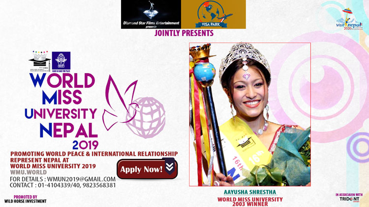 काठमाडौं । डायमण्ड स्टार फिल्म इन्टरटेनमेन्ट र भिसापार्क एजुकेसन कन्सल्टेन्सीको आयोजनामा ‘वल्र्ड मिस युनिभर्सिटी नेपाल २०१९’ आयोजना हुने भएको छ । यस प्रतियोगिताको विजेताले यही वर्षको अन्तिममा हुने ‘वल्र्ड मिस युनिभर्सिटीमा नेपालको प्रतिनिधित्व गर्दै विभिन्न ६० देशका प्रतिस्पर्धीसँग प्रतिस्पर्धा गर्ने अवसर पाउनेछिन् ।