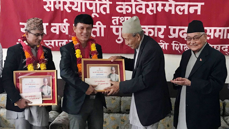 काठमाडौं । युवाकवि मोतीराम भट्टको सम्मानमा स्थापित युवावर्ष ‘मोती’ पुरस्कारबाट यसपटक काभ्रेका स्रष्टा फूलमान वल र धनकुटाका शंकर चापागाइ“ (धनकुटे कान्छा) सम्मानित भएका छन् । १५४ औं मोती जयन्तीको अवसरमा संस्कृतिविद एवं वाङमय शताब्दी पुरुष सत्यमोहन जोशीले पुरस्कार हस्तान्तरण गरे ।