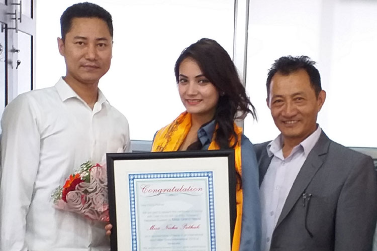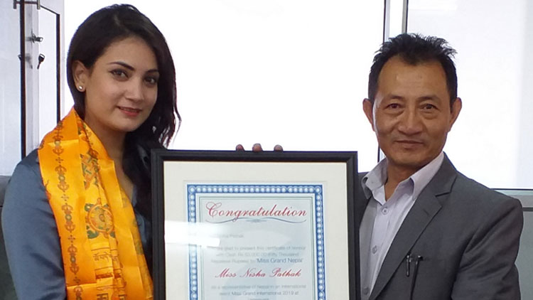 काठमाडौं । भेनेजुयलाको काराकास शहरमा आयोजना हुने अन्तराष्ट्रिय सौन्दर्य प्रतियोगिता ‘मिस ग्राण्ड इन्टरनेशनल २०१९’मा नेपालको प्रतिनिधित्व निशा पाठकले गर्ने भएकी छन् । ९ देखि २६ अक्टोबरसम्म आयोजना हुने प्रतियोगितामा निशा नेपाली कलासंस्कृति सहित प्रतियोगितामा सहभागी हुन लागेकी हुन् । उनी नेपालको एक्लो प्रतिनिधि हुन् ।उक्त प्रतियोगितामा नेपालको प्रतिधित्व गर्न लागेकी निशालाई कस्मो ट्रेडिङ प्रालीले नगद रु ५०,००० समेत सहयोग गरेको छ । बुधबार राजधानीमा एक कार्यक्रमका बिच कस्मो ट्रेडिङका अध्यक्ष रेशम लामाले निशालाई रकम हस्तान्तरण गरे ।
