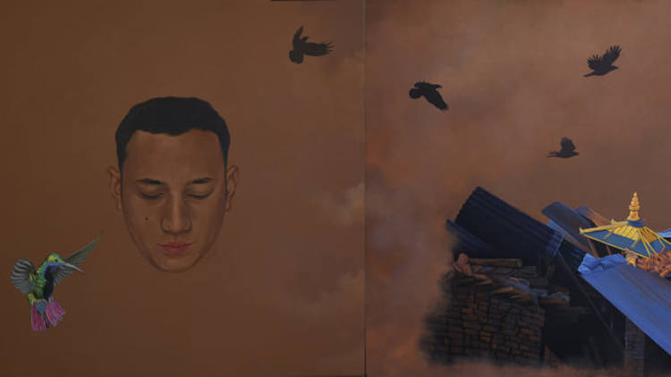 ०७२ सालमा आएको विनाशकारी भूकम्प र त्यसको कहरले निम्त्याएको दुखान्त विषयलाई समेत कलाकार श्रेष्ठले मार्मिकरुपमा उठाएका छन् । भत्किएका घर, सम्पदा तथा सांस्कृतिक धरोहरलाई चित्रमा प्रस्तुत गर्दै भूकम्पका कारण सामाजिक जीवनमा परेको प्रभावलाई केलाएका छन् ।