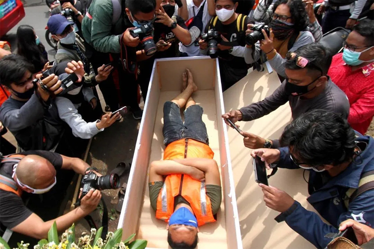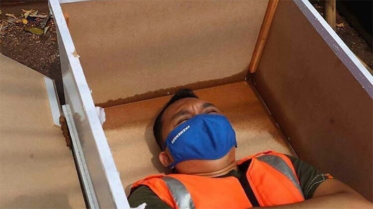 पूर्वी जकार्ताको पसर रेबोमा बिना मास्कका कैयौं मानिसलाई पक्राउ गरिएको थियो । बिहीबार उनीहरुलाई एक मिनेटसम्म कफिनमा राख्ने निर्णय गरियो । कफिनमा सुत्ने सजायको नियमको सोच पहिलोपटक आएको हो । जसका माध्यमबाट मानिसहरुमा फेस मास्कप्रति चासो बढाइएको छ ।
