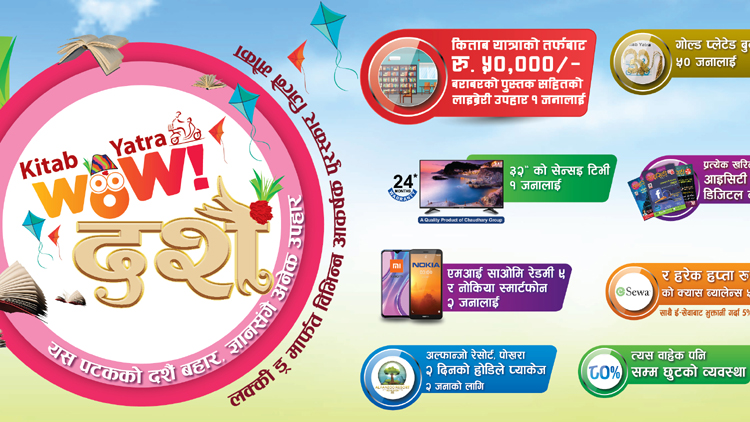 ’किताब यात्राको वाउ दशैं अफर सम्भवतः नेपालमा पहिलोपटक किताब खरिदमा दशैंमा यस्तो अफर ल्याइएको छ । सबैभन्दा महत्वपूर्ण कुरा भनेको पठन संस्कृतिमा थोरै भए पनि योगदान दिने उद्देश्यले यसपटक हामीले एक जनालाई रु ५०,००० बराबरको लाइब्रेरी उपहार दिदैछौं । हरेक खरिद मुल्यको २ प्रतिशत रकम किताब यात्रा पÞmाउण्डेशनले बनाउने किताब यात्रा लाइब्रेरी एण्ड रिसर्च सेन्टरमा अनुदानको रुपमा सहयोग गर्दैछौं । हाम्रो यो प्रयासमा हाम्रा सम्पूर्ण ग्राहकहरुले उल्लेखनीय सहभागिता हुने छ भन्नेमा हामी विश्वस्त छौं ।’ किताब यात्रा प्रालिका प्रमुख कार्याकारी अधिकृत विकेश भट्टराइले भने । उनका अनुसार पछिल्लो समय दशैंमा किताब पढ्नेहरुको संख्या दिनानुदिन बढिरहेका बेला ग्राहकहरुलाई लक्षित गर्दै यस्तो स्किम ल्याईएको हो ।