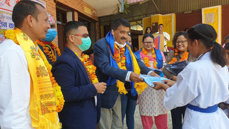 भक्तपुर । नेपाल क्योकुशिन सेइसिन काईकान कराँते संघको आयोजनामा आशापुरी डोजो भक्तपुरमा शनिबार घटस्थापनाको दिन पारेर शुभकामना आदानप्रदान तथा विद्यालय पोशाक वितरण कार्यक्रम आयोजना गरियो । विजय दशमी, दीपावली, नेपाल संवत नयाँ वर्ष ११४१ तथा छठ पर्वको अवसर पारेर आयोजित शुभकामना आदानप्रदान तथा विद्यालय पोशाक वितरण कार्यक्रमका क्रममा आशापुरी डोजो भक्तपुरको बेल्ट प्रमोशन टेष्ट कार्यक्रम पनि सञ्चालन गरिएको थियो । राष्ट्रिय खेलकुद परिषद्का सदस्य सचिव रमेश कुमार सिलवालको प्रमुख आतिथ्यमा सम्पन्न भएको हो । कराँते संघ तथा नेप्लिज फेसन होमको संयुक्त पहलमा भएको कार्यक्रममा सहभागी खेलाडीहरुलाई सदस्य सचिव सिलवालले विद्यालय पोशाक तथा स्टेशनरी हस्तान्तरण गरिएको थियो ।