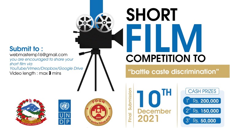 काठमाडौं । नेपाल चलचित्र निर्देशक समाजले कानुन,न्याय तथा संसदीय व्यवस्था मन्त्रालय र युनडीपीसँग मिलेर जातीय विभेदविरुद्ध लघु फिल्म प्रतियोगिताको घोषणा गरेको छ । निर्देशक समाज र युनडीपीद्वारा जारी सूचनाअनुसार फिल्मले जात व्यवस्था उन्मुलन सम्बन्धी विषयलाई ३ मिनेट भित्र प्रस्तुत गर्नुपर्नेछ ।