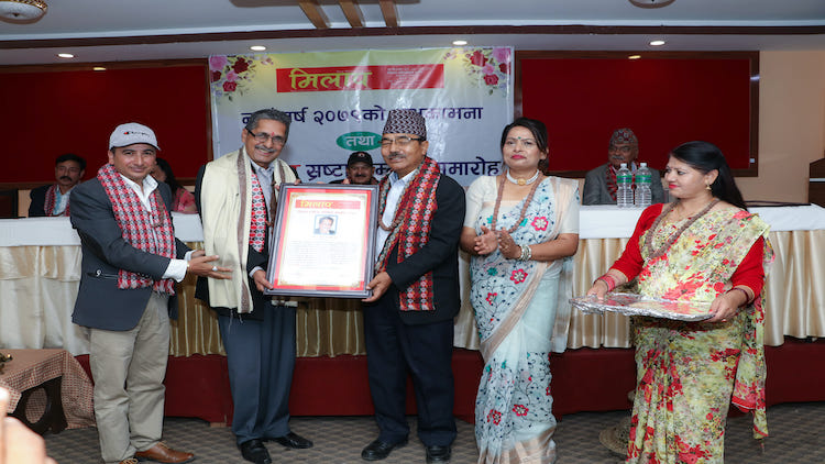 काठमाडौं । विगत बाह्र वर्षदेखि निरन्तर प्रकाशन हुँदै आएको मिलाप राष्ट्रिय मासिकले ‘मिलाप सम्मान तथा नयाँ वर्ष २०७९ शुभकामना आदान–प्रदान’ कार्यक्रम गरेको छ । काठमाडौंको कान्तिपथमा एक विशेष सामारोहबीच मिलापले पूर्वरक्षामन्त्री भीमसेन दास प्रधानको प्रमुख आतिथ्यतामा शुभकामना तथा मिलाप स्रष्टा सम्मान कार्यक्रम गरेको हो ।