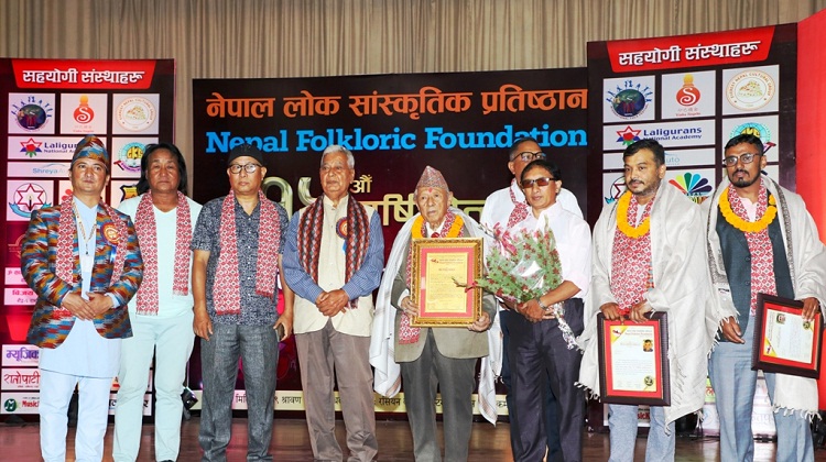 काठमाडौंँ । नेपालका प्रथम नृत्य निर्देशक भैरवबहादुर थापा ‘दीर्घ साधना सम्मान’ बाट सम्मानित भएका छन् । नेपाल लोक सांस्कृतिक प्रतिष्ठान १५ औं वार्षिकोत्सवको अवसरमा बुधवार रसियन कल्चर सेन्टरमा आयोजित ‘स्रष्टा सम्मान तथा सांस्कृतिक कार्यक्रम २०७९’ उनलाई नगद सहित सो सम्मान प्रदान गरिएको हो । कार्यक्रममा नेपाल समाचारपत्रका समाचार सम्पादक विदुर गिरीले पनि नगद सहित ‘दीर्घ रंग पत्रकारिता सम्मान’ प्राप्त गरे ।