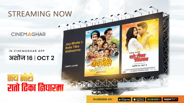 काठमाडौं । नेपाली ओटीटी प्लेटफर्म सिनेमाघर एपमा निर्माता तथा निर्देशक अशोक शर्माको दुई फिल्म ‘जय भोले’ र ‘रातो टीका निधारमा’ रिलिज भएका छन् । वडा दशैंको अवसर पारेर आइतबार फूलपातीबाट यी दुबै फिल्म ‘सिनेमाघर एप’मा रिलिज भएका छन् । अब दर्शकहरुले यो दुई फिल्मलाई केही सीमित रकम तिरेर दशैंको रमझममा घरमै बसेर हेर्न पाउनेछन् । ‘जय भोले’ २०७५ सालको सफल फिल्म हो भने ‘रातो टीका निधारमा’ २०७६ सालमा प्रदर्शन भएको थियो । यी दुवै फिल्मका निर्माता तथा निर्देशक अशोक शर्मा हुन् ।