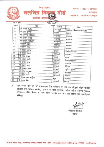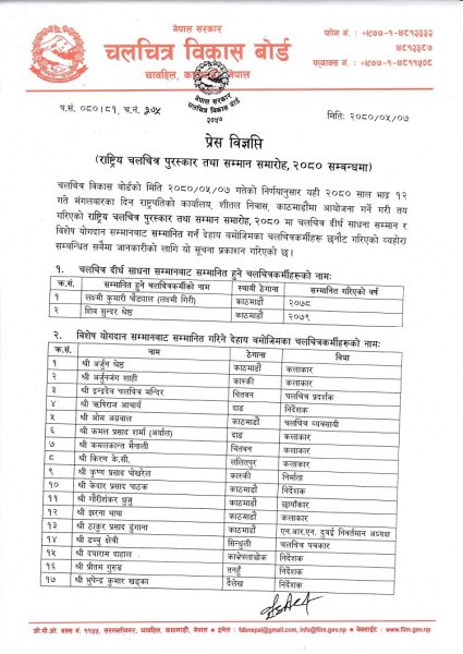 चलचित्र विकास बोर्डको मिति २०८०–०५–०७ गतेको निर्णयानुसार यही २०८० साल भाद्र १२ गते मंगलबारका दिन राष्ट्रपतिको कार्यालय¸ शीतल निवास¸ काठमाडौंमा आयोजना गर्ने गरी तय गरिएको पुरस्कार तथा सम्मान समारोहमा सम्मानित हुने नामावली सार्वजनिक गरेको हो । यसको पूर्ण विवरण बोर्डको वेबसाइट film.gov.np मा राखिएको छ ।