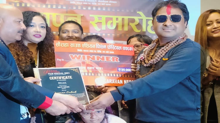 चितवन । ‘सौराहा दक्षिण एसियाली चलचित्र महोत्सव २०८०’ मा सर्वोत्कृष्ट चलचित्रको उपाधि ‘सतीदेवी’ ले प्राप्त गरेको छ । क्याराभान नेपालको आयोजनामा माघ १८ देखि २२ गतेसम्म पर्यटकीय नगरी चितवनको सौराहामा भएको महोत्सवमा सोमबार सर्वोत्कृष्ट चलिचित्र उपाधि प्रदान गरिएको हो ।’सतीदेवी’ ले सर्वोत्कृष्ट चलचित्रको उपाधिसँगै ५० हजार रूपैयाँ नगद पुरस्कार समेत जितेको छ । यो चलचित्र महोत्सवको प्रतिस्पर्धामा सहभागिता जनाएको भए पनि सार्वजनिक प्रदर्शनमा आउन बाँकी नै रहेको छ ।