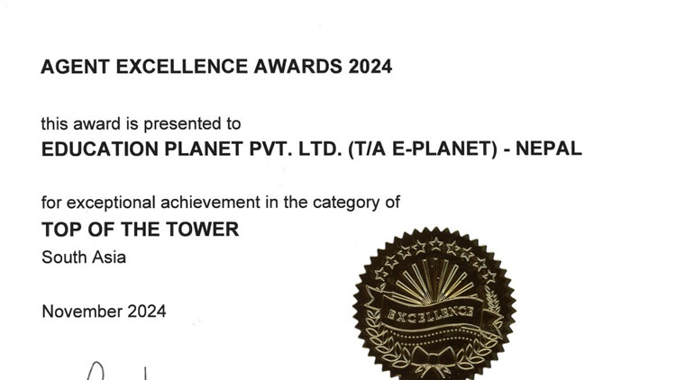 काठमाडौं । एजुकेशन प्लानेट प्रालि (ई–प्लानेट) ले आफ्नो उत्कृष्ट योगदानका लागि दक्षिण एशियामा ‘टप अफ द टावर’ शीर्षकको अवार्ड प्राप्त गर्दै ठूलो उपलब्धि हासिल गरेको छ । यो प्रतिष्ठित सम्मान एजेन्स एक्सिलेन्स अवार्ड २०२४ अन्तर्गत यूनिभर्सिटी अफ टेक्नोलोजी सिड्नी ९यूटिएस० ले प्रदान गरेको हो ।