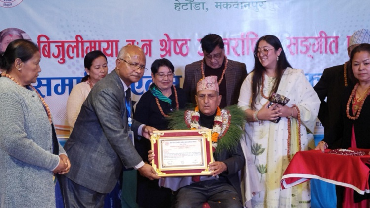 मकवानपुर । गीतकार किरण खरेललाई बिहीबार हेटौँडामा बिजुलीमाया वनः श्रेष्ठ अन्तरराष्ट्रिय सङ्गीत पुरस्कार प्रदान गरिएको छ । भीम विराग सङ्गीत साहित्य कला प्रतिष्ठान नेपालले हेटौँडा एक समारोहबीच रु एक लाख नगदसहित खरेललाई पुरस्कृत गरेको हो ।