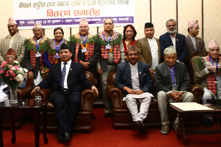 राजधानीमा शुक्रबार आयोजित कार्यक्रममा उपराष्ट्रपति नन्दकिशोर पुनले गीतकार किरण खरेल, बाद्यबादक एवम् शास्त्रीय संगीतकार पुष्परत्न तुलाधर, लोकगीत संकलन एलपी (लक्ष्मीप्रसाद) जोशी, अभिनेत्री एवम् नृत्य कलाकार सुभद्रा अधिकारी, नाटक अनुसन्धानकर्ता प्रा डा रामावतार यादब, नाट्यकर्मी मदनदास श्रेष्ठलाई पुरस्कृत गरे । उनीहरुलाई जनही एक लाख एक रुपैंयाँ र ताम्रपत्र प्रदान गरिएको थियो ।