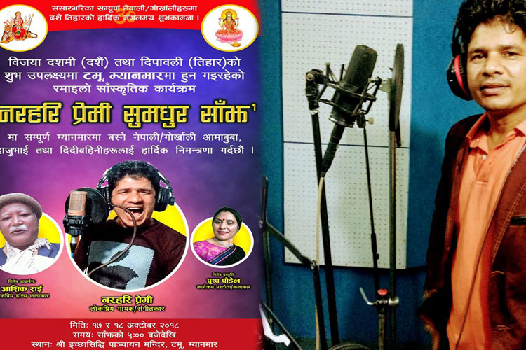 काठमाडौं । दुई दशकदेखि नेपाली सांगीतिक क्षेत्रमा सक्रिय गायक तथा संगीतकार नरहरि प्रेमी आगामी अक्टोबर १७ र १८ मा म्यानमारमा गुञ्जिने भएका छन् । उनको सम्मानमा आयोजना हुन लागेको ‘नरहरि प्रेमी सुमधुर साँझ’मा उपस्थित म्यानमारमा बस्दै आएका नेपालीलाई आफ्ना गीतमा झुमाउनेछन् ।