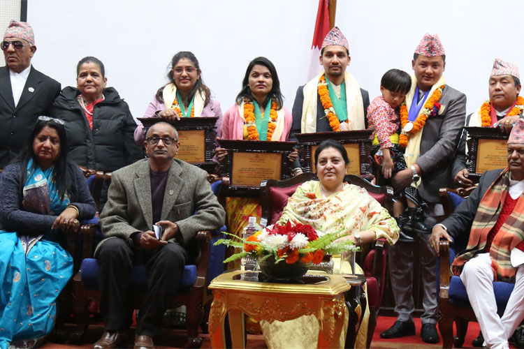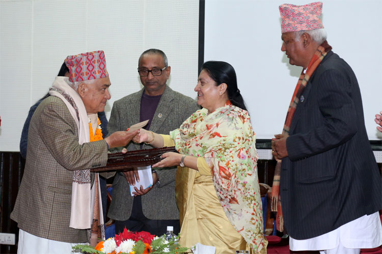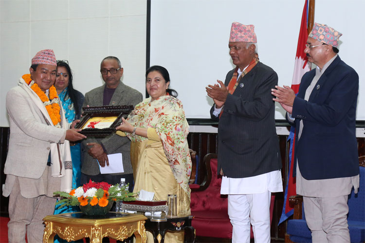 काठमाडौं । राष्ट्रपति विद्यादेवी भण्डारीले नेपाल प्रज्ञा–प्रतिष्ठानका विभिन्न प्रज्ञा पुरस्कार र राष्ट्रिय कविता महोत्सवमा विजयी कविलाई मंगलबार आयोजित समारोहमा पुरस्कृत गरेकी छन् । राष्ट्रपति भवन शीतल निवासमा आयोजित कार्यक्रममा यस वर्षको कविता महोत्सवमा प्रथम चन्द्र रानहँछा र द्वितीय सुवास राई ‘क्याप्टेन’ तथा तृतीय दीपेन्द्र उपाध्याय, उर्मिला कोइराला र अमृता ‘स्मृति’ लाई पुरस्कार प्रदान गरिएको हो । प्रथम हुनेलाई रु ३० हजार, द्वितीयका लागि रु २५ र तृतीयका लागि रु २० हजारसहित पदक दिइएको छ । गत असार ९ गते प्रतिष्ठानको ६०औँ वार्षिकोत्सवमा आयोजित प्रतियोगितामा ती कवि पुरस्कृत घोषित भएका हुन् ।
