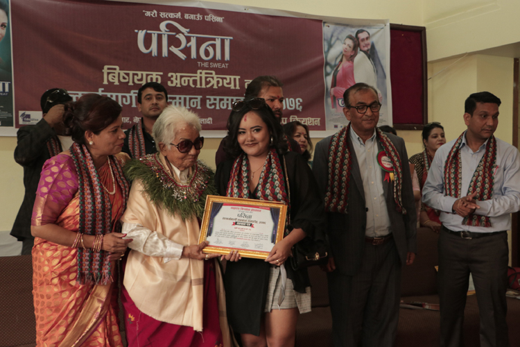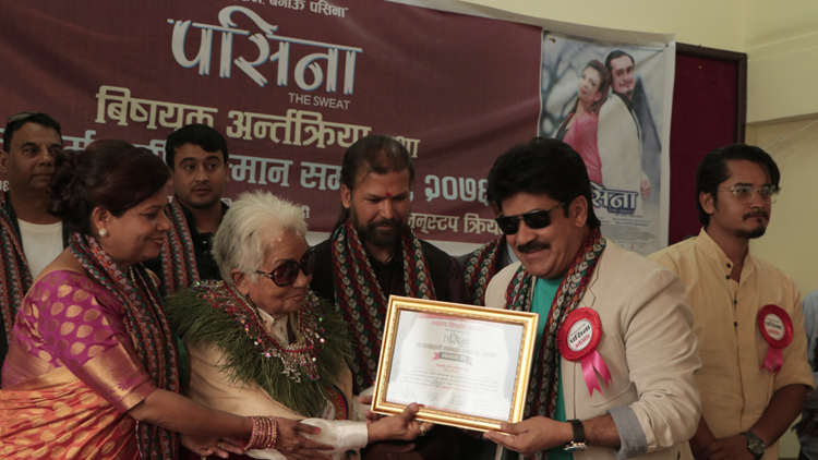 काठमाडौं । भोलि शुक्रबारबाट प्रदर्शनमा आउन लागेको फिल्म ‘पसिना’ले गत बुधबार राजधानीमा एक कार्यक्रम गर्दै स्रस्तालाई सत्कर्म मार्गी सम्मान दान गरेको छ । पूर्वमन्त्री तथा समाजसेवी भद्रकुमारी घलेको प्रमुख आतिथ्यतामा सम्पन्न कार्यक्रममा चलचित्रका कलाकार तथा अन्य समाजका लब्ध प्रतिष्ठित व्यक्तित्वहरुलाई सम्मान गरिएको थियो।